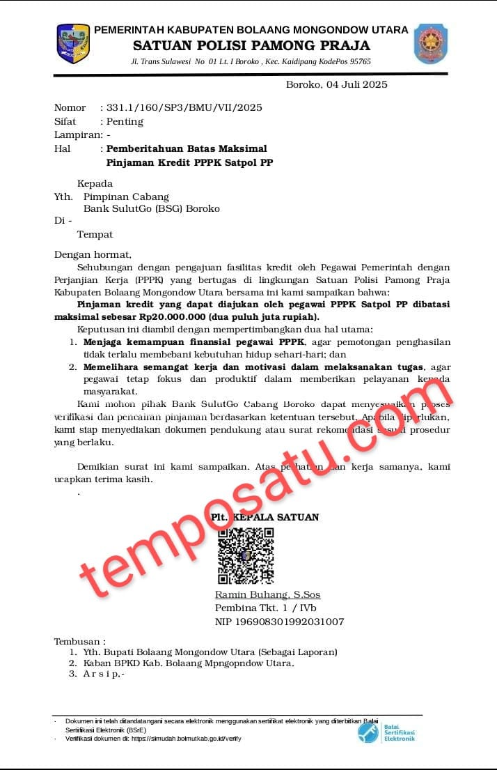 Boltara, temposatu.com – Sejumlah pegawai Pegawai Pemerintah dengan Perjanjian Kerja (PPPK) di Kabupaten Bolaang Mongondow Utara (Boltara) menyuarakan keberatannya terhadap keputusan PLT Kepala Satuan Polisi Pamong Praja (Kasat Pol-PP) yang diduga menghambat proses pengajuan pinjaman bank dengan plafon tertentu.