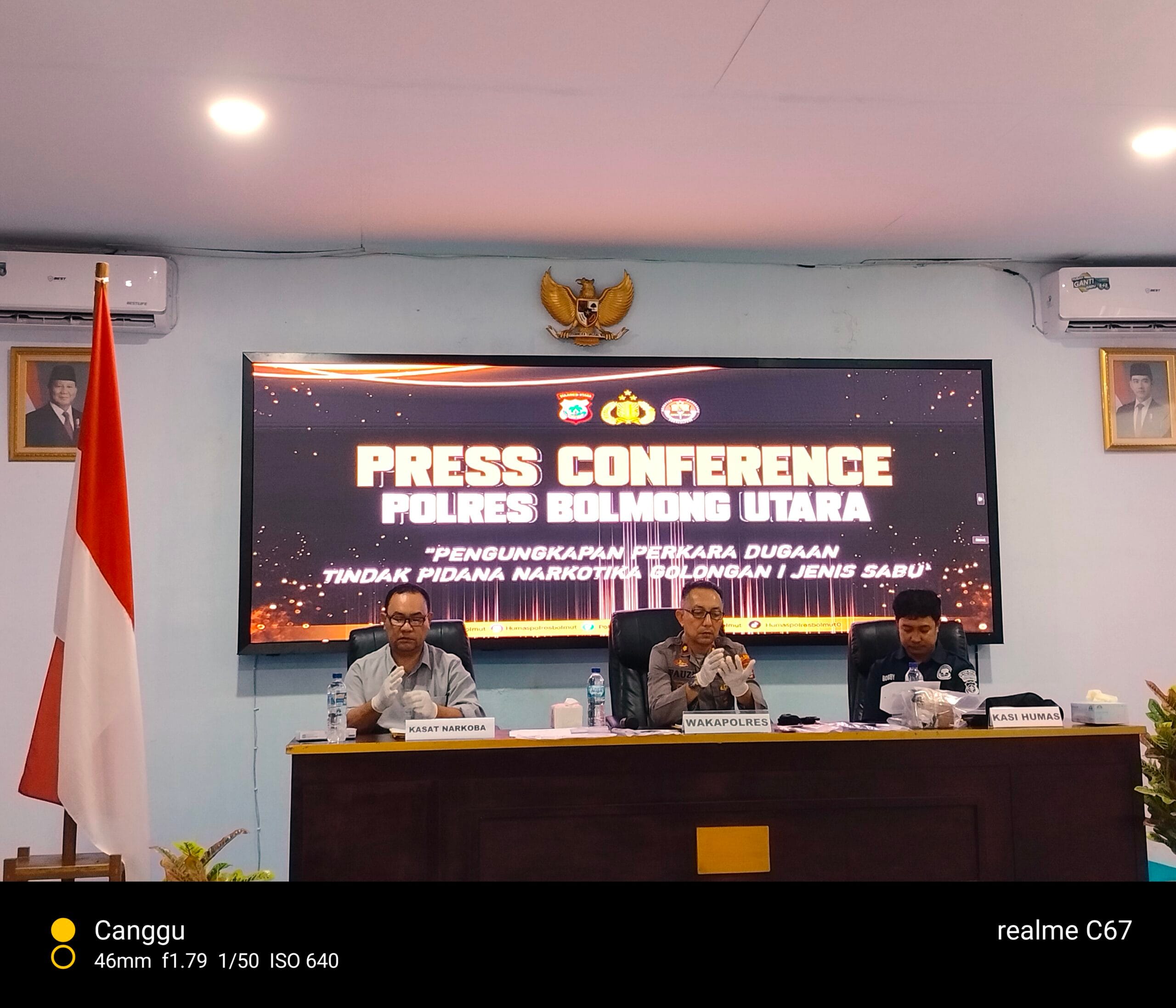 Press conference dipimpin langsung oleh Wakapolres Bolmut, Kompol Abdul Rahman Faudji, S.H., M.H., didampingi Kasat Narkoba Iptu Hevri Samson, S.H., serta Ps. Kasi Humas Aiptu Zulkarnain Noe.
