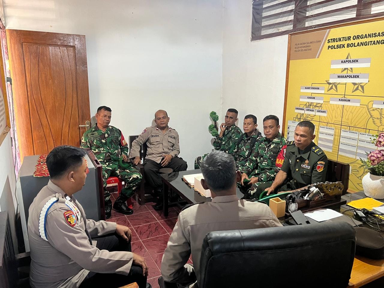 Kunjungan ini dipimpin langsung oleh Danramil 1303-14 Bolangitang, Pelda Ishak Gani, beserta personel Koramil. Kedatangan mereka disambut hangat oleh Kapolsek Bolangitang IPTU J. Indrawan Mamonto bersama anggota Polsek Bolangitang.